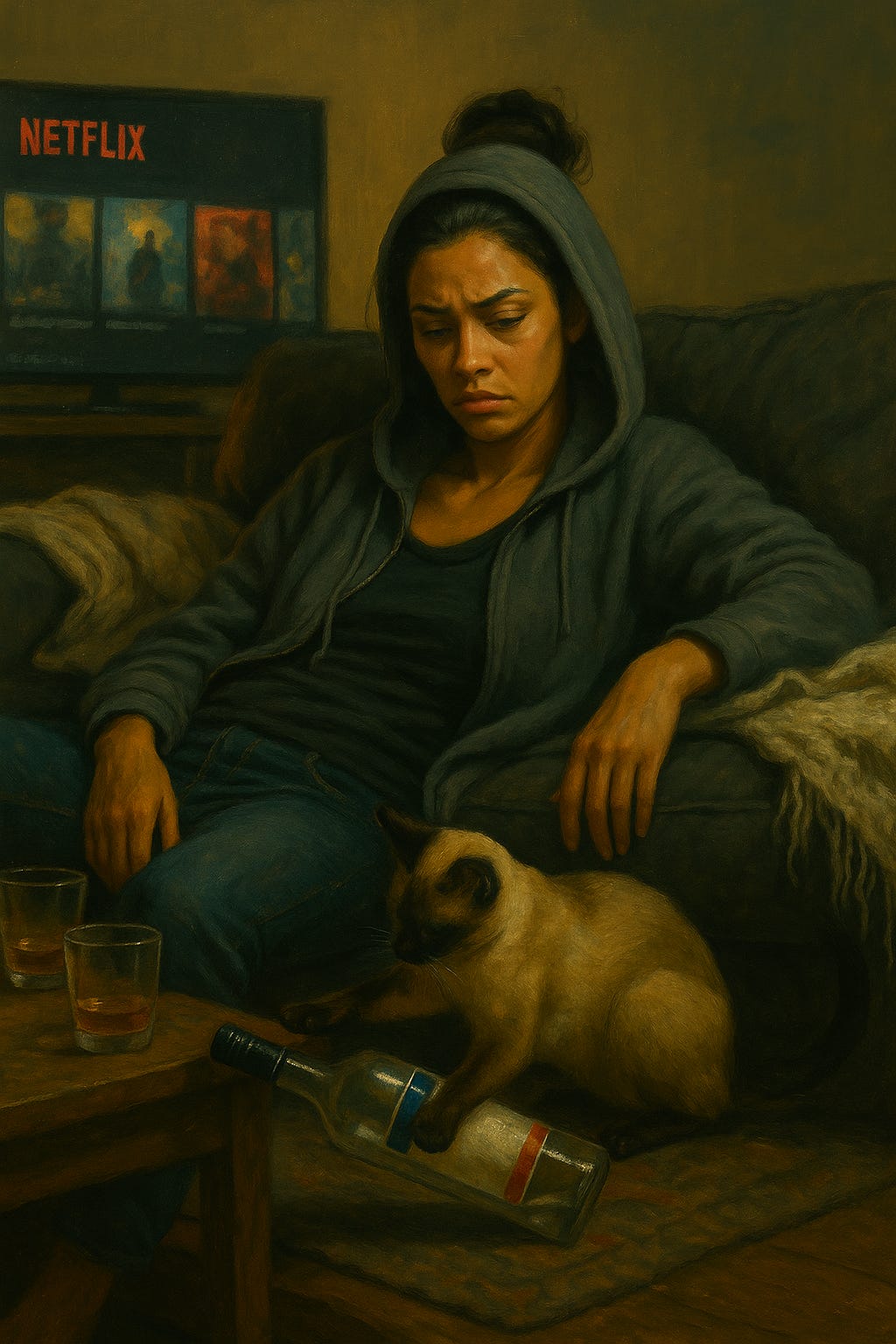 The vodka burns nicely, warming me and bringing a soft slipperiness to my thoughts. The fantasy of going out fades as I pour another drink. My mind starts spinning, I know she’s out there, stealthily waiting like a tigress hunting her prey, tail flicking to and fro. Scenarios start forming : maybe she wants to apologize. Maybe she wants a payoff. Maybe she’s planning a tell-all and wants to warn me. Maybe….